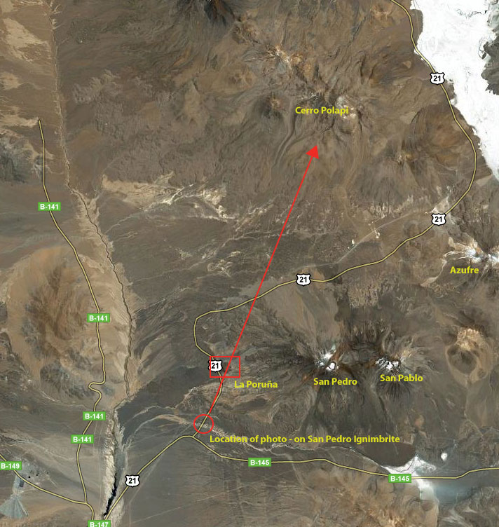 Below is the (now annotated) original image where I asked you to identify not only the scoria cone, but the volcano in the background and the unit in the foreground. Here is what I am sure of: the scoria cone is La Poruña (see top left for another view), the unit in the foreground is the San Pedro Ignimbrite (which Highway 21 cuts through in a drainage) and the near ridge in the background are lava flows from San Pedro. Now, this is where it gets tricky - the volcano in the far background is, well, mysterious. Eruptions reader Robin identifying the distant peak as Cerro Polari, but I have yet to find any information about the peak. I have posted a Google Maps satellite image showing where I took the photo and the direction I was facing, showing La Poruña, San Pedro/San Pablo and nearby Azufre. The Bobs identified the distant peak as part of Cerro Polapi, an older composite volcano and sure enough, that is the correct ID.