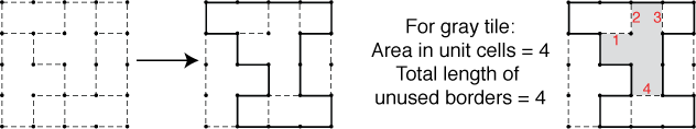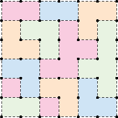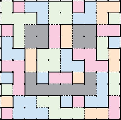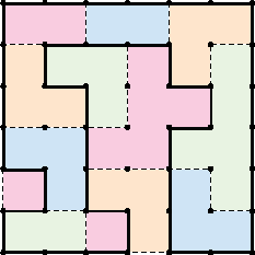Rules: Draw a single closed loop that does not intersect itself using just the dotted lines of the grid. Each (colored) tile of area N must have a total length of unused dotted segments of exactly N.