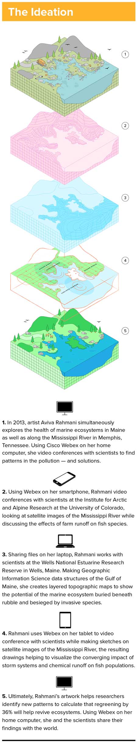 The final phase of the creative process is the debut — an experience increasingly transforming audiences into artists thanks to technology. In the past, after putting the final brush stroke to canvas, artists would send their pieces to distant galleries, leaving them to hang for people to see. But with the rise of new collaboration technologies, artists are not only using software and devices to work together to make art — they are then also using those tools to interact more fully with their audiences, empowering spectators to become artists themselves in innovative new mediums like VR and augmented reality. “The unlocking of real-time experiences in virtual reality is creating a giant shift in our culture,” says Pardo. “In the same way that smartphones changed our world, this technology is going to impact our lives.”